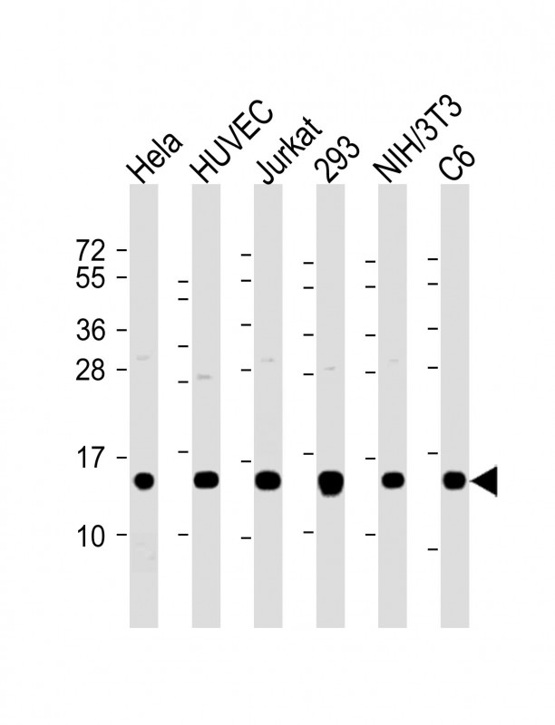 All lanes : Anti-Profilin-1 Antibody at 1:2000 dilution Lane 1: Hela whole cell lysate Lane 2: HUVEC whole cell lysate Lane 3: Jurkat whole cell lysate Lane 4: 293 whole cell lysate Lane 5: NIH/3T3 whole cell lysate Lane 6: C6 whole cell lysate Lysates/proteins at 20 μg per lane. Secondary Goat Anti-Rabbit IgG, (H+L), Peroxidase conjugated at 1/10000 dilution. Predicted band size : 15 kDa Blocking/Dilution buffer: 5% NFDM/TBST. |