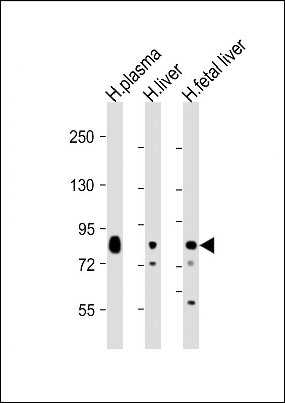 All lanes : Anti-Transferrin Antibody at 1:2000 dilution Lane 1: human plasma lysate Lane 2: human liver lysate Lane 3: human fetal liver lysate Lysates/proteins at 20 μg per lane. Secondary Goat Anti-Rabbit IgG, (H+L), Peroxidase conjugated at 1/10000 dilution. Predicted band size : 77 kDa Blocking/Dilution buffer: 5% NFDM/TBST.