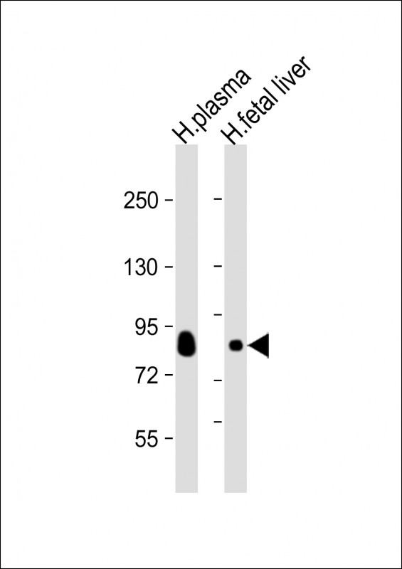 All lanes : Anti-Transferrin Antibody at 1:2000 dilution Lane 1: human plasma lysate Lane 2: human fetal liver lysate Lysates/proteins at 20 μg per lane. Secondary Goat Anti-Rabbit IgG, (H+L), Peroxidase conjugated at 1/10000 dilution. Predicted band size : 77kDa Blocking/Dilution buffer: 5% NFDM/TBST. |