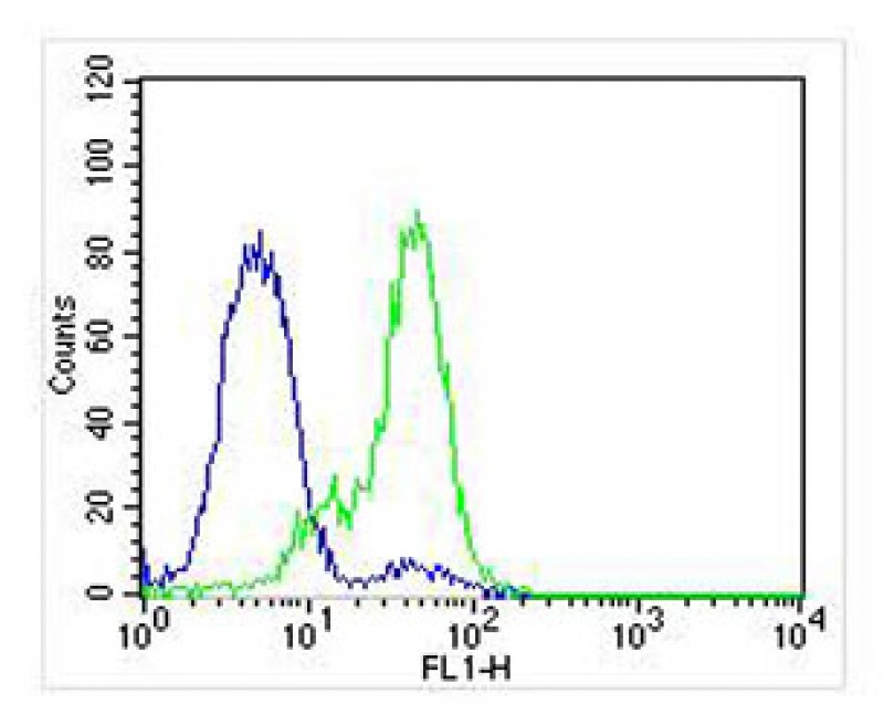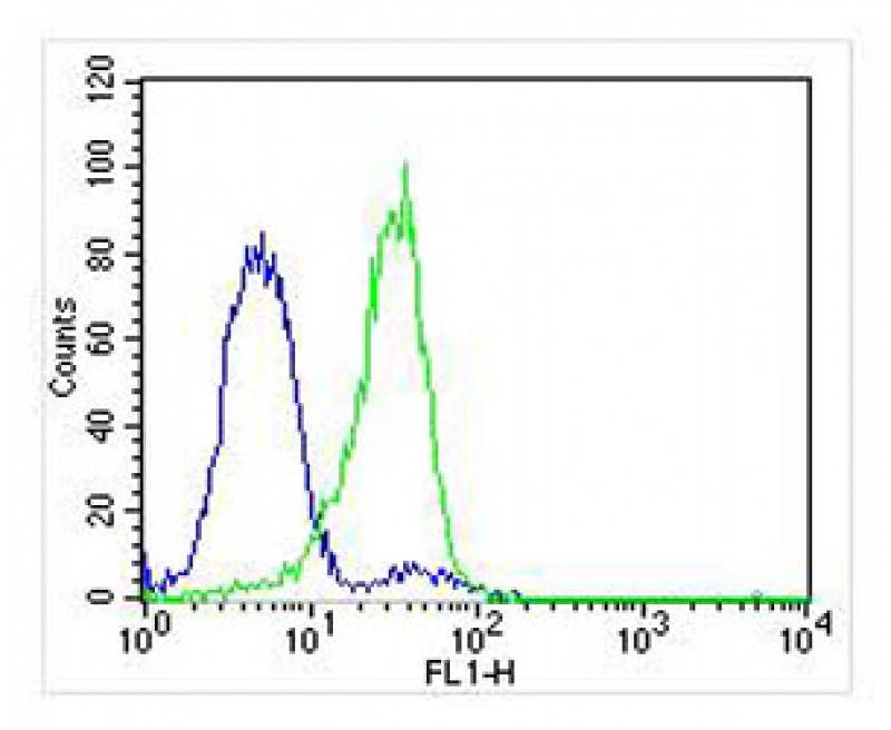 Overlay histogram showing Hela cells stained with AP2512D (green line). The cells were fixed with 2% paraformaldehyde (10 min) and then permeabilized with 90% methanol for 10 min. The cells were then icubated in 2% bovine serum albumin to block non-specific protein-protein interactions followed by the antibody (AP2512D, 1:25 dilution) for 60 min at 37?C. The secondary antibody used was Goat-Anti-Rabbit IgG, DyLight? 488 Conjugated Highly Cross-Adsorbed(NA168821) at 1/400 dilution for 40 min at 37?C. Isotype control antibody (blue line) was rabbit IgG (1μg/1x10^6 cells) used under the same conditions. Acquisition of >10, 000 events was performed.