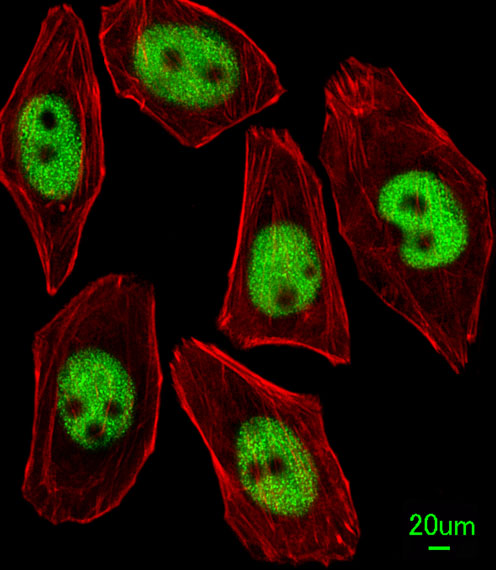 Immunofluorescent analysis of U251 cells, using KLF4 Antibody (Cat. APR05060G). APR05060G was diluted at 1:25 dilution. Alexa Fluor 488-conjugated goat anti-rabbit lgG at 1:400 dilution was used as the secondary antibody (green). Cytoplasmic actin was counterstained with Dylight Fluor? 554 (red) conjugated Phalloidin (red).