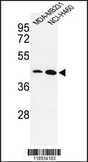 Western blot analysis of KLF4-S457 (Cat. APR05060G) in MDA-MB231, NCI-H460 cell line lysates (35ug/lane). KLF4 (arrow) was detected using the purified Pab.