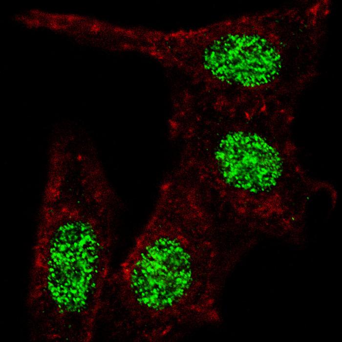 Fluorescent confocal image of HeLa cells stained with APR05060G KLF4 (S457) antibody. HeLa cells were fixed with 4% PFA (20 min), permeabilized with Triton X-100 (0.2%, 30 min), then incubated with APR05060G KLF4 (S457) primary antibody (1:100, 2 h at room temperature). For secondary antibody, Alexa Fluor? 488 conjugated donkey anti-rabbit antibody (green) was used (1:1000, 1h). Cytoplasmic actin was counterstained with Alexa Fluor? 555 (red) conjugated Phalloidin (5.25 μM, 25 min). Note the highly specific localization of the phosphorylated KLF4 immunoreactivity to the nuclei but not the cytoplasm. |