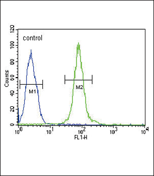 YWHAG Antibody (N-term) (Cat. APR05095G) flow cytometric analysis of Hela cells (right histogram) compared to a negative control cell (left histogram).FITC-conjugated goat-anti-rabbit secondary antibodies were used for the analysis. |