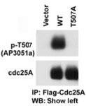 The anti-Phospho-CDC25A-T507 Pab (Cat. APR05106G) is used in Western blot to detect Phospho-CDC25A-T507 in cells transfected with wild type or mutant T507 A of CDC25A. Data courtesy of Dr. Tiebang Kang of Washington University, St. Louis, MO. |