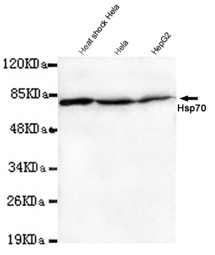 Western blot detection of Hsp70(N-terminus) in Heat shcok Hela,Hela and HepG2 lysates using Hsp70(N-terminus) mouse mAb (1:1000 diluted).Predicted band size: 70KDa.Observed band size: 70KDa.