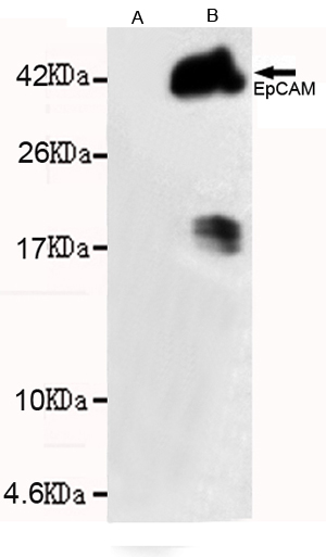 Western blot analysis of extracts from CHO-K1 cells,transfected with a human pDisplay-flag construct (A) or transfected with a human pDisplay-flag-EpCAM construct (B), using EpCAM mouse mAb (1:1000 diluted).Predicted band size:40KDa.Observed band size:40KDa. |