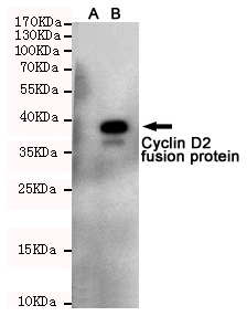 Western blot detection of Cyclin D2 in CHO-K1 cell lysate(A)and CHO-K1 transfected by Cyclin D2-fragment EGFP fusion protein(B)cell lysate using Cyclin D2 mouse mAb (1:1000 diluted).Predicted band size:38KDa.Observed band size:38KDa. |
