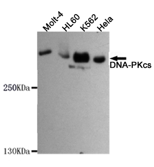 Western blot detection of DNA-PKcs in Hela,K562,HL-60 and MOLT-4 cell lysates using DNA-PKcs mouse mAb (1:1000 diluted).Predicted band size:450KDa,Observed band size:450KDa.