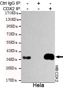 Immunoprecipitation analysis of Hela cell lysate using CDX2 mouse mAb. |