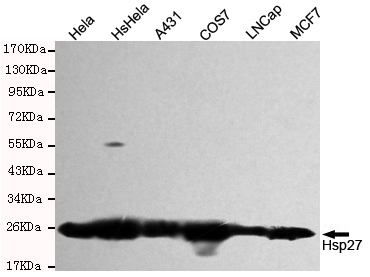 Western blot detection of Hsp27 in Hela,HsHela,A431,COS7,Lncap and MCF7 cell lysates and using Hsp27 mouse mAb (1:1000 diluted).Predicted band size: 23KDa.Observed band size:27KDa.