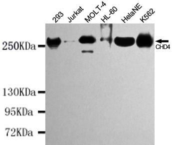 Western blot detection of CHD4 in K562,HelaNE,HL-60,MOLT-4,Jurkat and 293 cell lysates using CHD4 mouse mAb (1:1000 diluted).Predicted band size:260KDa.Observed band size:260KDa.