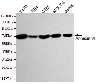 Western blot detection of Annexin VI in T47D,MB4,CEM,MOLT-4 and Jurkat cell lysates and using Annexin VI mouse mAb (1:1000 diluted).Predicted band size: 76KDa.Observed band size:76KDa. |