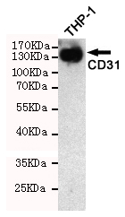 Western blot detection of CD31 in THP-1 cell lysate using CD31 mouse mAb (1:1000 diluted).Predicted band size: 130KDa.Observed band size: 130KDa. |