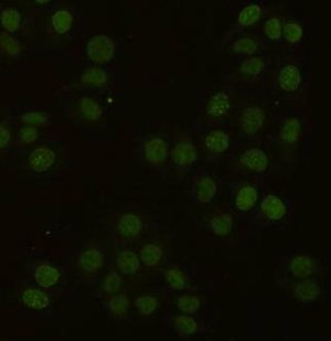 Immunocytochemistry staining of HeLa cells using PCNA mouse mAb (dilution 1:100).Fixed in 100% methanol for 2hr at -20℃.