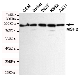 Western blot detection of MSH2 in K562,CEM,Jurkat,293T and A431 cell lysates using MSH2 mouse mAb (1:1000 diluted).Predicted band size:100KDa.Observed band size:100KDa. |