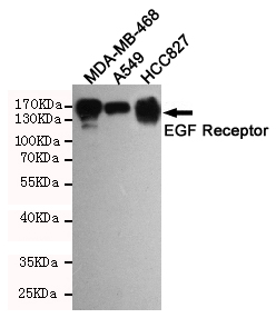 Western blot detection of EGFR in HCC827,A549 and MDA-MB-468 cell lysates using EGFR mouse mAb(dilution 1:1000).Predicted band size:134 Kda.Observed band size:175KDa.