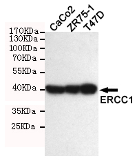 Western blot detection of ERCC1 in T47D,ZR75-1,CaCO2 and Molt-4 cell lysate using ERCC1 mouse mAb (1:1000 diluted).Predicted band size: 39KDa.Observed band size: 39KDa. |