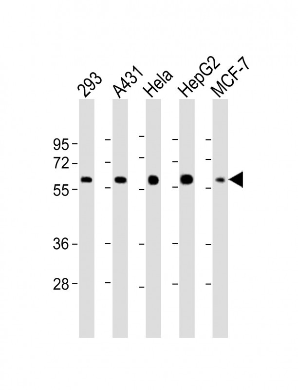 All lanes : Anti-p53 Antibody (S315) at 1:2000 dilution Lane 1: 293 whole cell lysate Lane 2: A431 whole cell lysate Lane 3: Hela whole cell lysate Lane 4: HepG2 whole cell lysate Lane 5: MCF-7 whole cell lysate Lysates/proteins at 20 μg per lane. Secondary Goat Anti-Rabbit IgG, (H+L), Peroxidase conjugated at 1/10000 dilution. Predicted band size : 44 kDa Blocking/Dilution buffer: 5% NFDM/TBST.