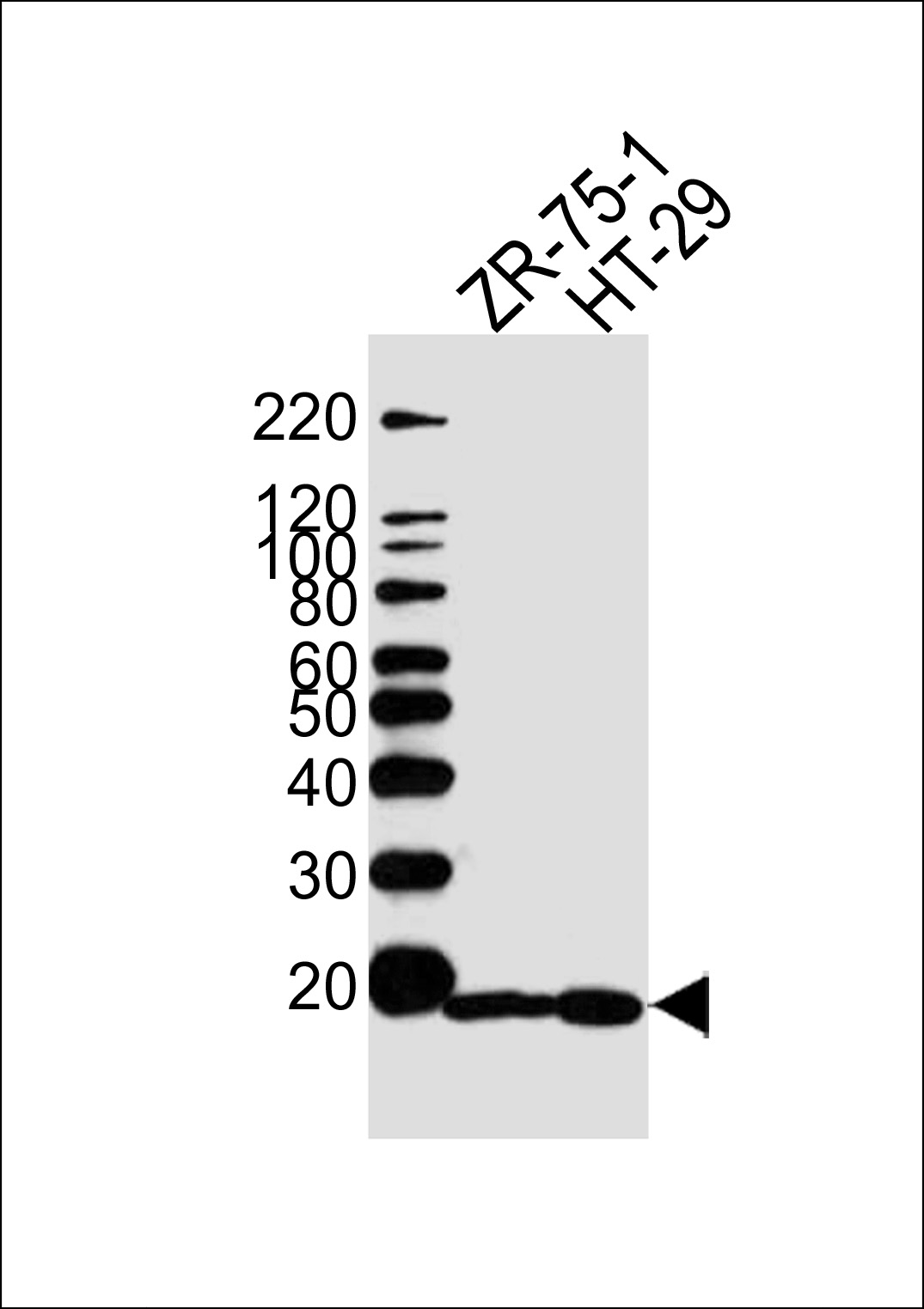 Western blot analysis of lysates from ZR-75-1, HT29 cell line (from left to right), using AGR2 Antibody (Center)(APR05737G). APR05737G was diluted at 1:1000 at each lane. A goat anti-rabbit IgG H&L(HRP) at 1:5000 dilution was used as the secondary antibody. Lysates at 35ug per lane.