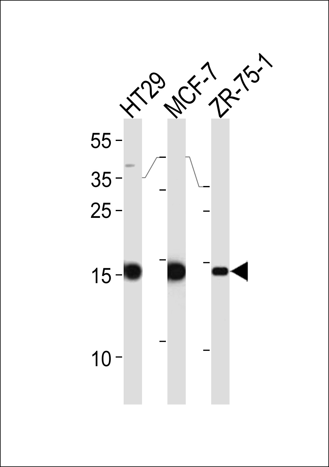 AGR2 Antibody (Center) (Cat. APR05737G) western blot analysis in HT29,MCF-7,ZR-75-1 cell line lysates (35ug/lane).This demonstrates the AGR2 antibody detected the AGR2 protein (arrow).