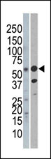 Western blot analysis of anti-C-rel (NFkB) Pab (APR05746G)in Jurkat (left) and mouse kidney (right) cell line lysate. C-rel (NFkB)(arrow) was detected using the purified Pab. |