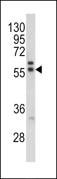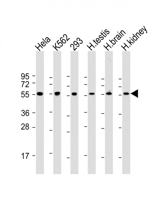 All lanes : Anti-MAPE Antibody (C-term) at 1:2000 dilution Lane 1: Hela whole cell lysate Lane 2: K562 whole cell lysate Lane 3: 293 whole cell lysate Lane 4: human testis lysate Lane 5: human brain lysate Lane 6: human kidney lysate Lysates/proteins at 20 μg per lane. Secondary Goat Anti-Rabbit IgG, (H+L), Peroxidase conjugated at 1/10000 dilution. Predicted band size : 58 kDa Blocking/Dilution buffer: 5% NFDM/TBST.