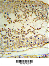 MAPE Antibody (C-term) (RB18763) IHC analysis in formalin fixed and paraffin embedded human testis tissue followed by peroxidase conjugation of the secondary antibody and DAB staining. This data demonstrates the use of the MAPE Antibody (C-term) for immunohistochemistry. Clinical relevance has not been evaluated. |