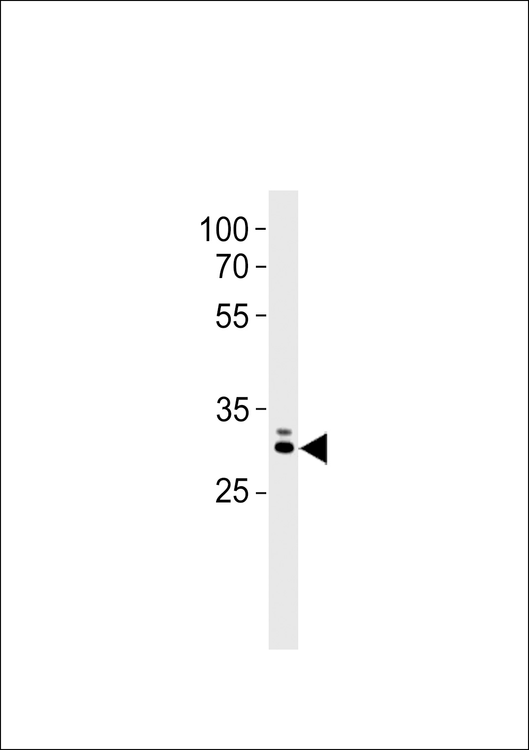 Meox1 Antibody (C-term) (Cat. APR05874G) western blot analysis in 293 cell line lysates (35ug/lane).This demonstrates the Meox1 antibody detected the Meox1 protein (arrow). |