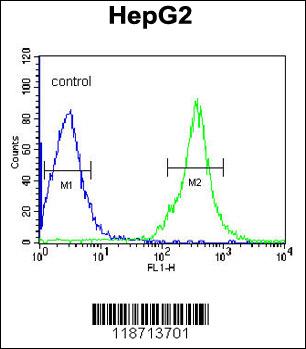 FGG Antibody (N-term) (Cat. APR05885G) flow cytometric analysis of HepG2 cells (right histogram) compared to a negative control cell (left histogram).FITC-conjugated goat-anti-rabbit secondary antibodies were used for the analysis.