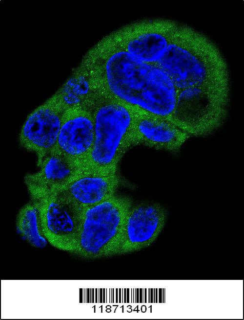 Confocal immunofluorescent analysis of FGG Antibody (N-term)( APR05885G) with HepG2 cell followed by Alexa Fluor 488-conjugated goat anti-rabbit lgG (green).DAPI was used to stain the cell nuclear (blue). |