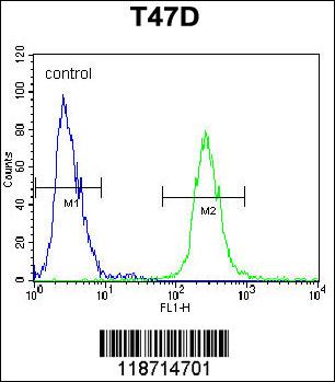 FGG Antibody (C-term) (Cat. APR05886G) flow cytometric analysis of T47D cells (right histogram) compared to a negative control cell (left histogram).FITC-conjugated goat-anti-rabbit secondary antibodies were used for the analysis. |