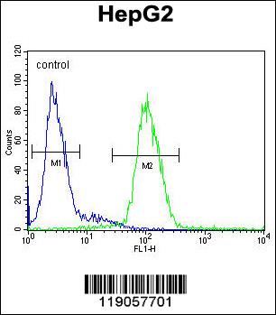 CP Antibody (N-term) (Cat. APR05892G) flow cytometric analysis of HepG2 cells (right histogram) compared to a negative control cell (left histogram).FITC-conjugated goat-anti-rabbit secondary antibodies were used for the analysis. |