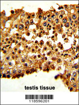 Formalin-fixed and paraffin-embedded human testis tissue with PTTG1 Antibody (N-term), which was peroxidase-conjugated to the secondary antibody, followed by DAB staining. This data demonstrates the use of this antibody for immunohistochemistry; clinical relevance has not been evaluated. |