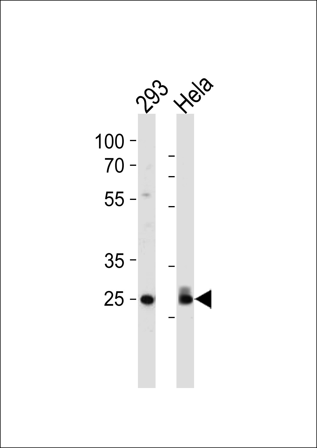 Cdk2 Antibody (T14) (Cat. APR05923G) western blot analysis in 293,Hela cell line lysates (35ug/lane).This demonstrates the hCdk2 antibody detected the hCdk2 protein (arrow).