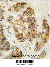 Formalin-fixed and paraffin-embedded human breast carcinoma tissue reacted with CDK2 Antibody (T14) (Cat.APR05923G), which was peroxidase-conjugated to the secondary antibody, followed by DAB staining. This data demonstrates the use of this antibody for immunohistochemistry; clinical relevance has not been evaluated. |