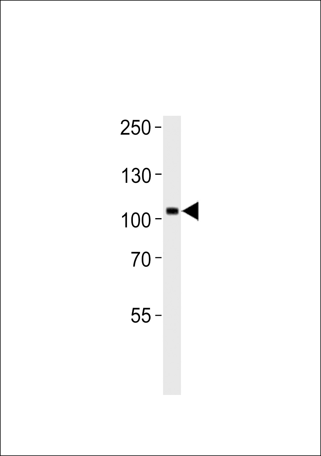 TrkC Antibody (Cat. APR05995G) western blot analysis in U87-MG cell line lysates (35ug/lane).This demonstrates the TrkC antibody detected the TrkC protein (arrow). |