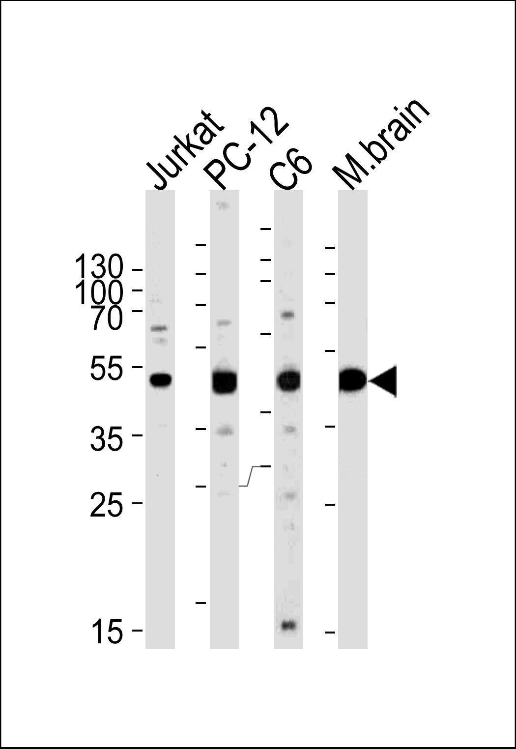 Western blot analysis of lysates from Jurkat,rat PC-12 and C6 cell line,mouse brain tissue (from left to right),using MAP2K1 Antibody (P1)(Cat. APR06038G).APR06038G was diluted at 1:1000 at each lane. A goat anti-rabbit IgG H&L(HRP) at 1:5000 dilution was used as the secondary antibody.Lysates at 35ug per lane.