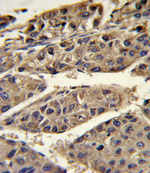 Formalin-fixed and paraffin-embedded mouse hepatocarcinoma reacted with HP Antibody (Center), which was peroxidase-conjugated to the secondary antibody, followed by DAB staining. This data demonstrates the use of this antibody for immunohistochemistry; clinical relevance has not been evaluated. |