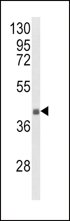 Western blot analysis of HLA-G Antibody (Center) (Cat. APR06131G) in NCI-H460 cell line lysates (35ug/lane). HLA-G (arrow) was detected using the purified Pab. |