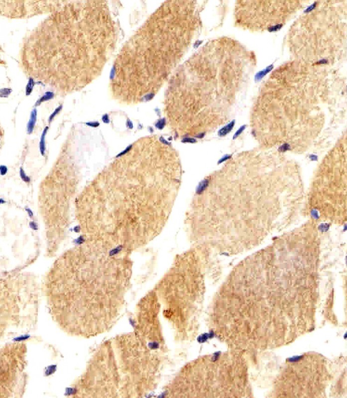 Immunohistochemical analysis of paraffin-embedded H. skeletal muscle section using CARD6 Antibody (Center)( APR06138G). APR06138G was diluted at 1:25 dilution. A undiluted biotinylated goat polyvalent antibody was used as the secondary, followed by DAB staining. |
