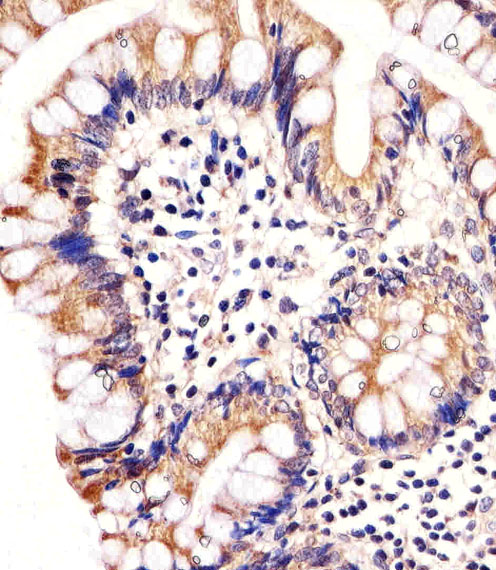 Immunohistochemical analysis of paraffin-embedded H. colon section using CARD6 Antibody (Center)( APR06138G). APR06138G was diluted at 1:25 dilution. A undiluted biotinylated goat polyvalent antibody was used as the secondary, followed by DAB staining.