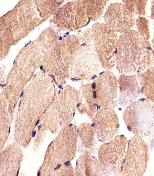 Immunohistochemical analysis of paraffin-embedded H. skeletal muscle section using CARD6 Antibody (Center)( APR06138G). APR06138G was diluted at 1:25 dilution. A undiluted biotinylated goat polyvalent antibody was used as the secondary, followed by DAB staining.