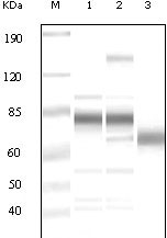 Figure 1: Western blot analysis using anti-KSHV ORF8 polyclonal antiobdy against uninduced BCBL1 cell lysate (1), TPA induced BCBL1 cell lysate(2) and purified virion (3). |