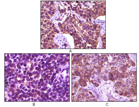 Figure 2: Immunohistochemical analysis of paraffin-embedded human lung carcinoma (A), lymph tissue (B) and skin carcinoma (C), showing membrane localization using BLK mouse mAb with DAB staining. |