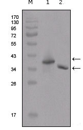 Figure 1: Western blot analysis using Flag mouse mAb against two different fusion protein (1), (2) with flag tag. |