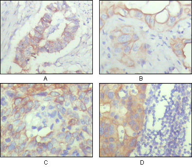 Figure 1: Immunohistochemical analysis of paraffin-embedded human ovary carcinoma (A), kidney carcinoma (B), lung carcinoma (C) and breast carcinoma (D), showing cytoplasmic and membrane localization with DAB staining using ALCAM mouse mAb.