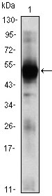 Figure 1: Western blot analysis using RAG2 mouse mAb against RAG2(AA: 350-527)-hIgGFc transfected HEK293 (1)cell lysate.