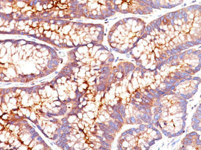 This antibody recognizes proteins of 80-200kDa, identified as different members of CEA family. CEA is synthesized during development in the fetal gut and is re-expressed in increased amounts in intestinal carcinomas and several other tumors. This MAb does not react with nonspecific cross-reacting antigen (NCA) and with human polymorphonuclear leucocytes. It shows no reaction with a variety of normal tissues and is suitable for staining of formalin/paraffin tissues. CEA is not found in benign glands, stroma, or malignant prostatic cells. Antibody to CEA is useful in detecting early foci of gastric carcinoma and in distinguishing pulmonary adenocarcinomas (60-70% are CEA+) from pleural mesotheliomas (rarely or weakly CEA+). Anti-CEA positivity is seen in adenocarcinomas from the lung, colon, stomach, esophagus, pancreas, gallbadder, urachus, salivary gland, ovary, and endocervix.?