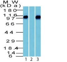 Western Blot of beta Catenin (p120) in human brain in 1) absence and 2) presence of immunizing peptide and 3) mouse brain Lysate using beta Catenin (p120) Polyclonal Antibody. |